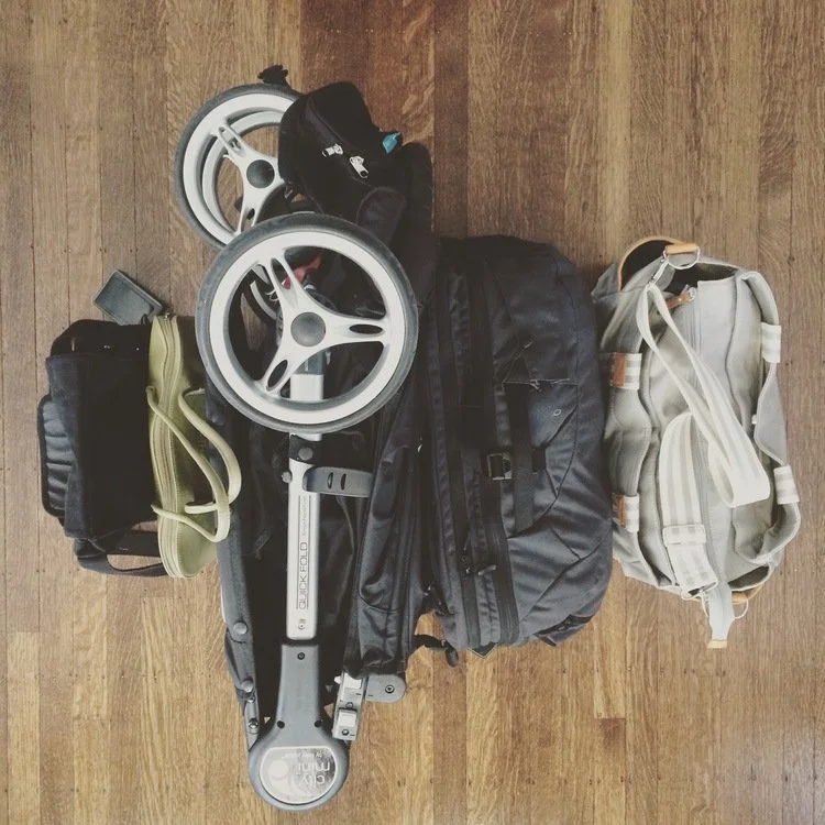 I posted this picture on social media, a picture that encapsulates the entirety of what we packed. (From left to right you see two smaller carry-ons [my green bag has become my daily 'diaper bag'], a stroller, a backpack and the more traditional diaper bag.) I got some questions about how we managed this.