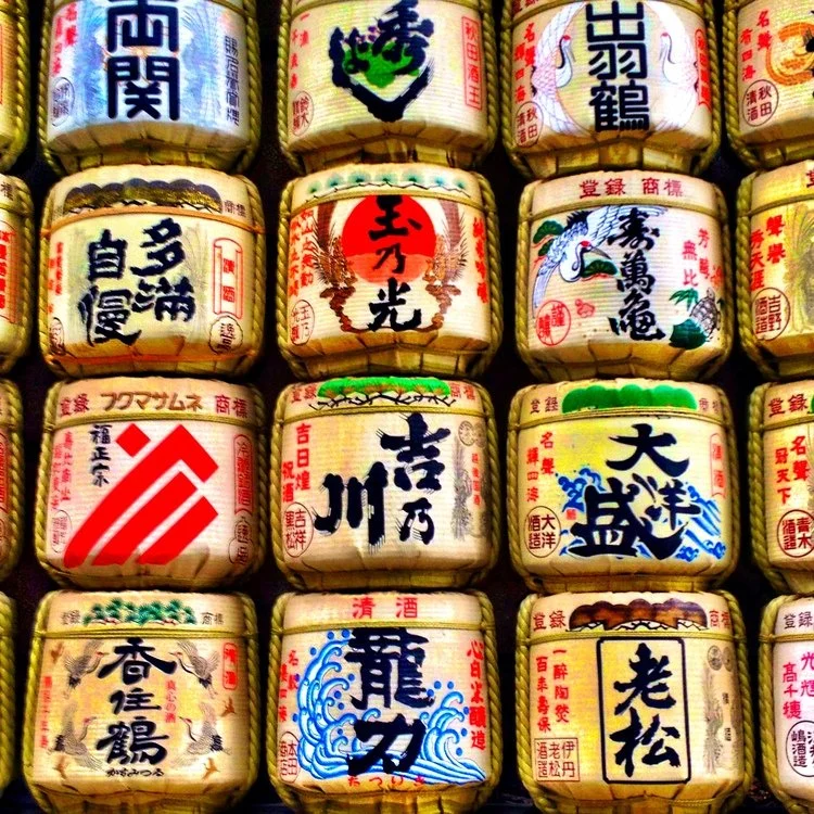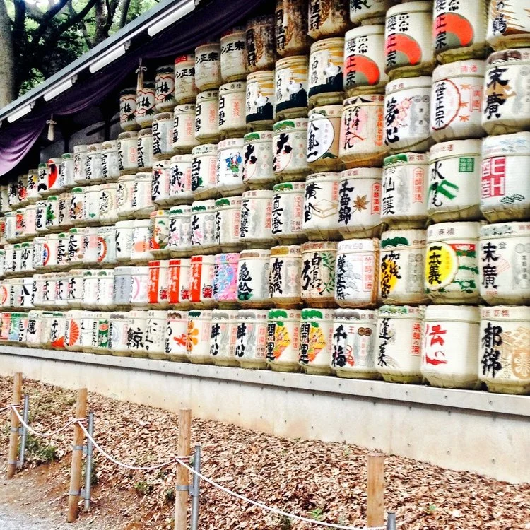 Sake barrels at the entrance of Meiji Shrine. Tokyo, Japan.