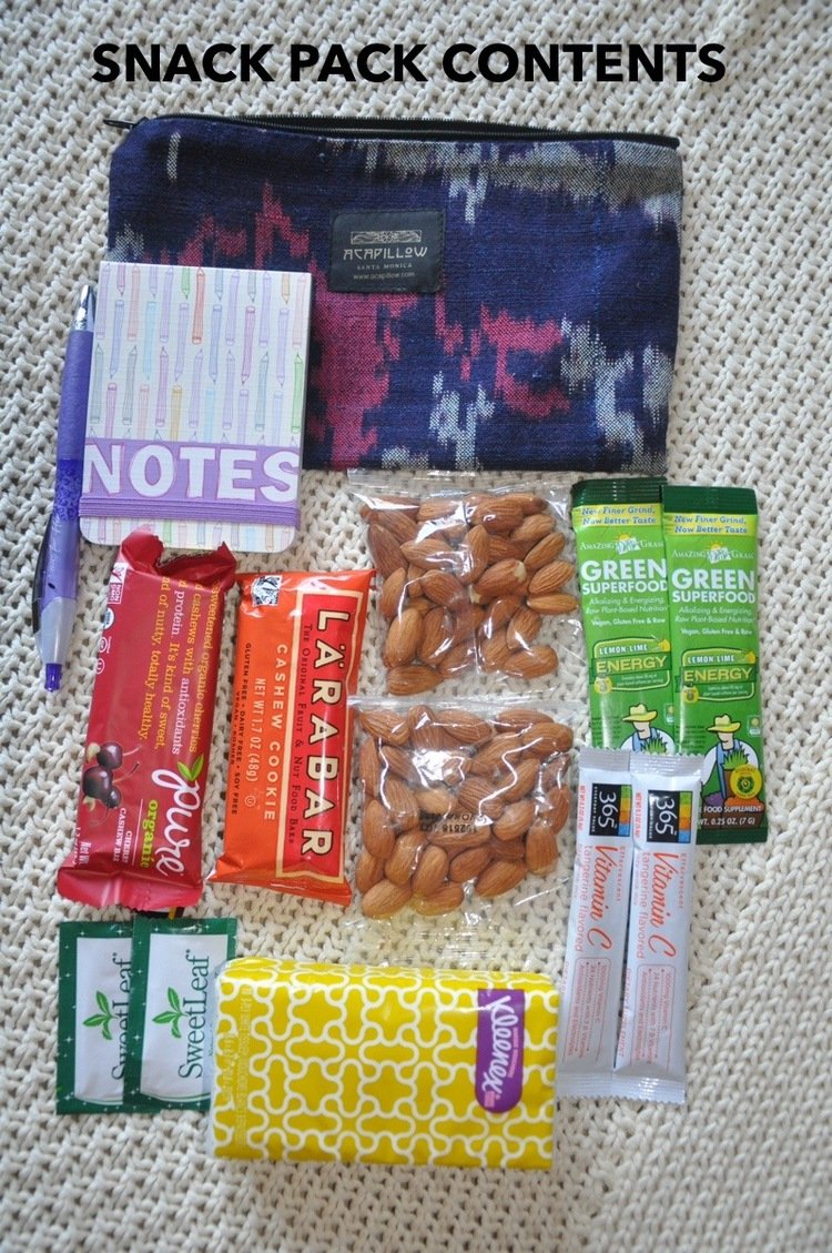 In addition to my snack pack, my carry-on bag includes: