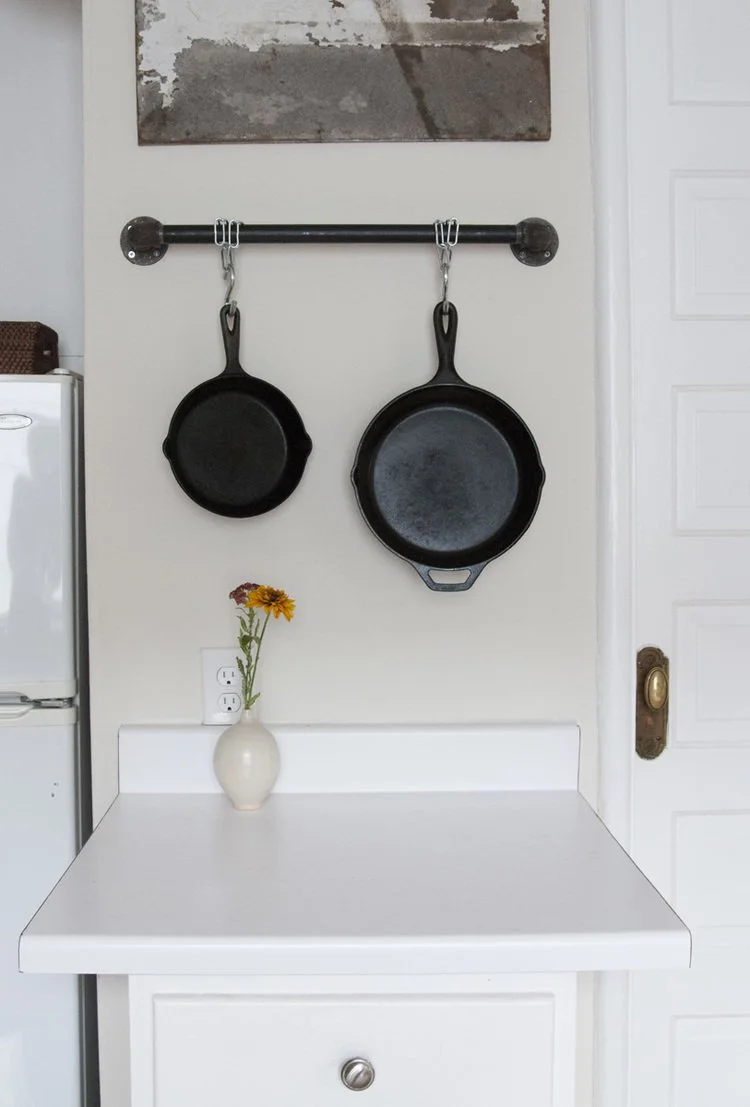 Artwork above the skillets repurposed from pieces found at demolition sites; pantry shelving made from poplar.