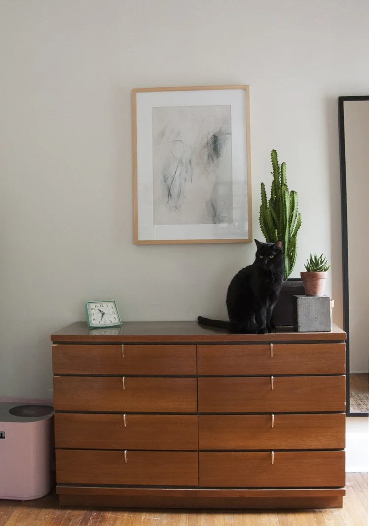 I take great pride in making my home beautiful, comfortable and welcoming to anyone who walks in my door. Throughout my life, my mom always made a point that anyone was welcome at our house and we always invited “lone rangers” to family get togethers such as Thanksgiving or Christmas dinners. That value is something that I carry with me to this day and I love to host people, make them feel welcomed and provide nourishment. Without the love of friends and interesting people in my space, it would not feel like a home. The other component that makes my space serene is being extremely intentional. I am not afraid to get rid of something that does not belong. When you choose to live simply, you have to come to terms with the fact that just because you like an item or you think it is beautiful, doesn’t mean that you need it in your home. You have to be choosy with what you decide belongs in order to create a good balance in your space. Lastly, I have two pets, a cat and a dog, and they bring both light and joy to my space that I could not imagine being without.